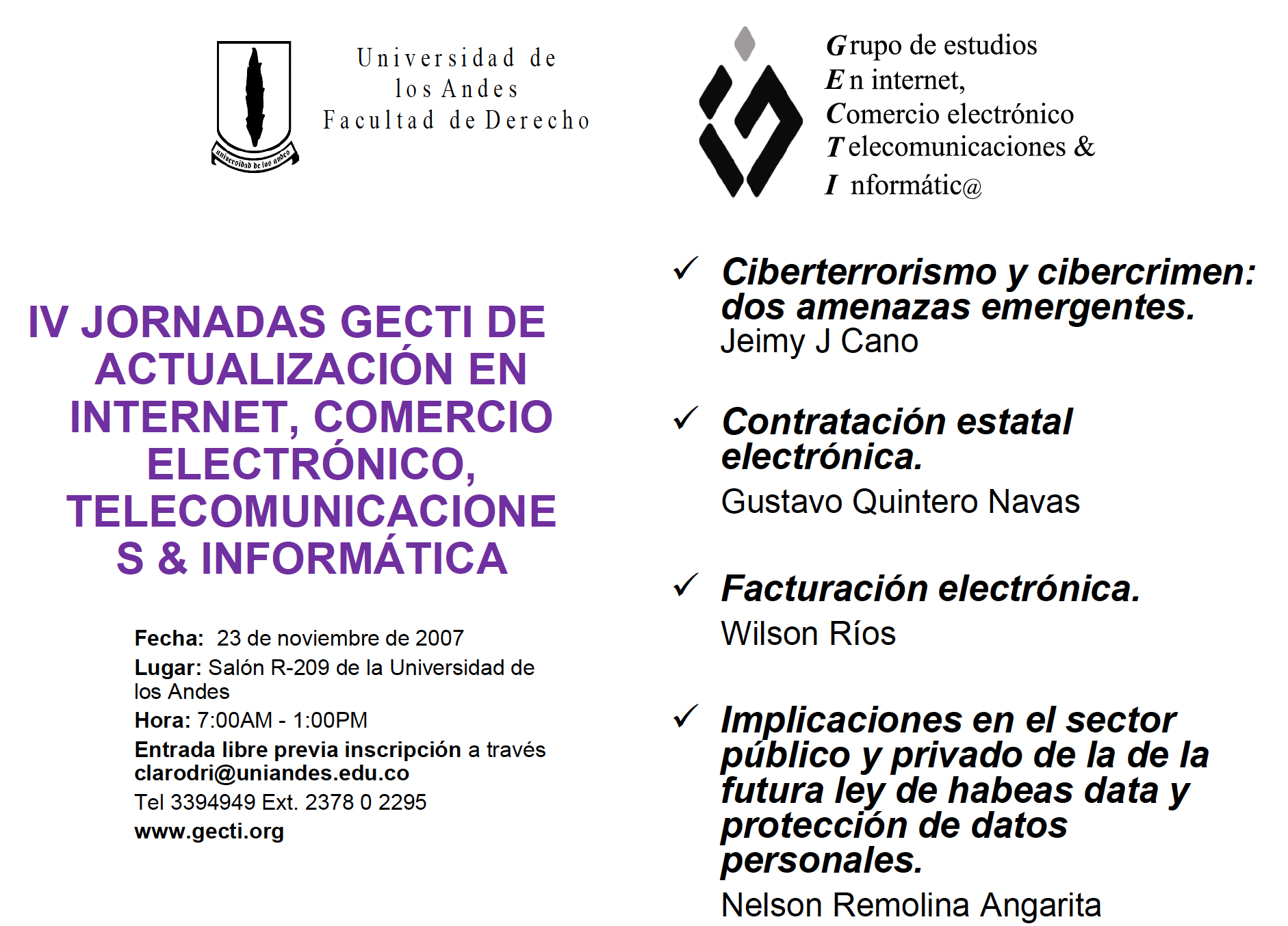 Conferencias sobre: i) Evidencia digital: admisibilidad y valor probatorio; ii) Conflictos de jurisdicción y competencia en internet; iii) La televisión colombiana: de canal en canal; iv) Contratación estatal electrónica.